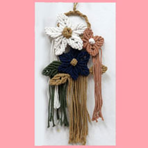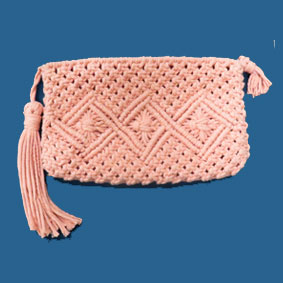 でこちゃん マクラメのディリーバック「ひし形模様のクランチバック。斜め巻結びでひし形模様を結ぶのは目を揃えるのに少しきをつかいましたと書かれていますが、目が揃ってとても綺麗に編まれ素敵なバックです。 |