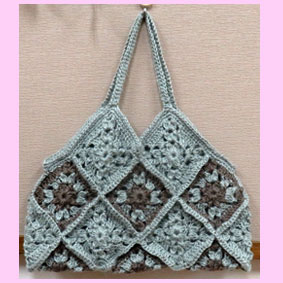 くわちゃん ナチュラル素材で編む「大人のクロッシェバック」滑りにくい麻の糸でグレーを10枚こげ茶9枚のモチーフを編み