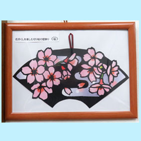 | よねちゃん 切り絵<桜>刃先を入れて紙を動かして綺麗に切られています。色付きの台紙の上に切り絵をのせると流水の上に桜が咲く景色が浮かびます。 |