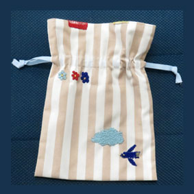 まっちゃん ものを大切にするための初めてのお直しテクニック「モチーフを描く」刺繡糸を針に通すのが大変だったようですが雲、鳥、お花がきれいに刺してあります。 |